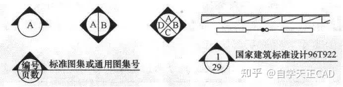 平面图、剖面图中的局部需另绘详图时,应在平、剖面图上标注索引符号。索引符号的画法见下图。